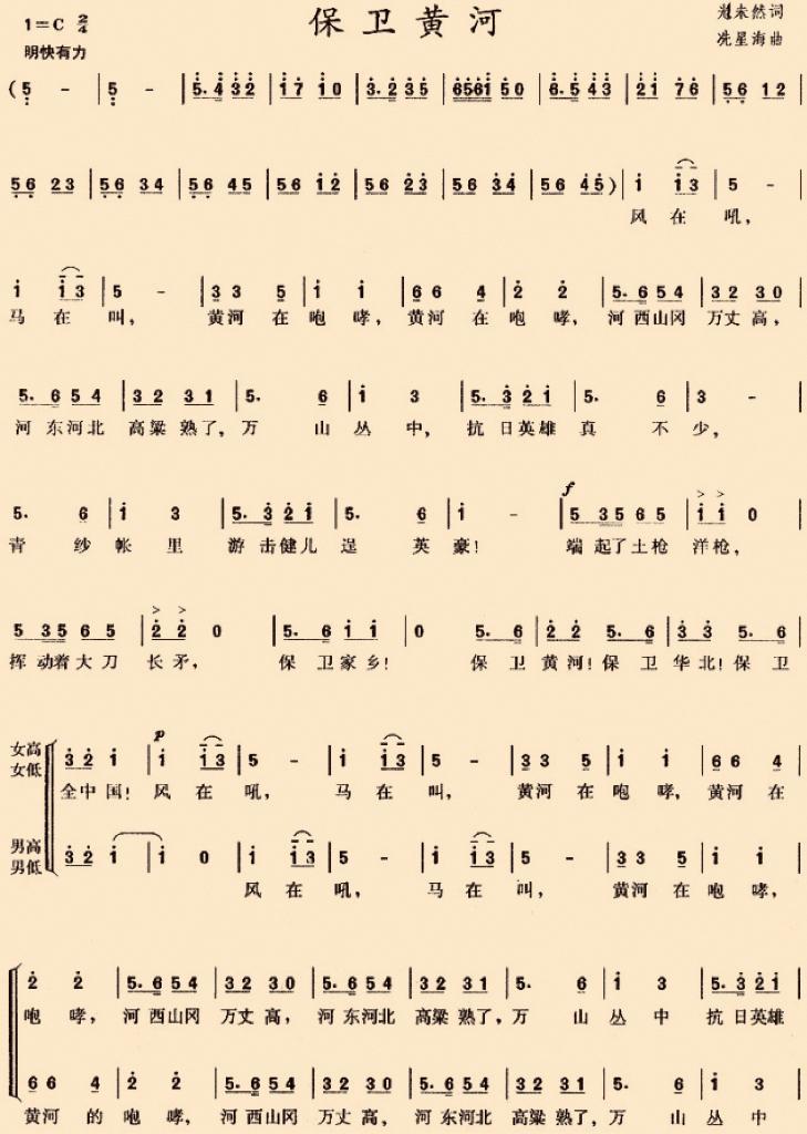 《黄河大合唱》是由光未然作词,冼星海作曲,于1939年完成首演的声乐作品,1941年被改写成交响乐合唱。《黄河大合唱》从开始创作到搬上舞台只用了短短46天时间,1938年9月,光未然奉周恩来之命,慰问鼓动前线将士抗战。东渡黄河的所见所闻激发了光未然最初的创作灵感,他要写一首描写抗战、歌颂中华的长诗。经过充分的研究和准备后,冼星海开始谱曲,六个日夜,在延安简陋的窑洞,完成了大合唱简谱的创作。