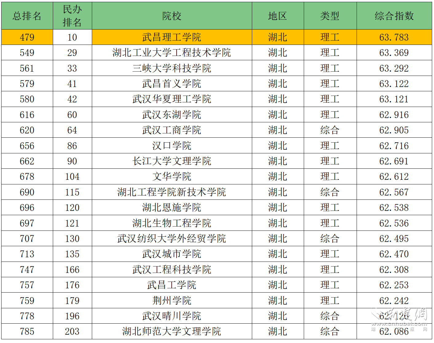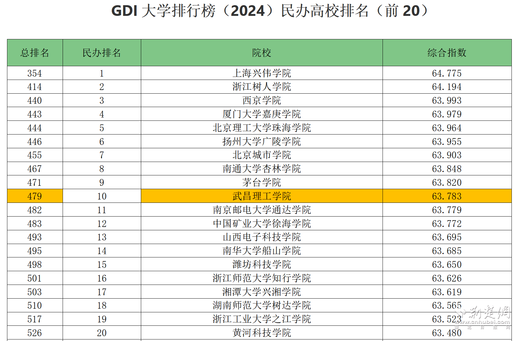 4月17日,GDI大学排行榜(2024)对外发布。在2024年GDI中国大学800强(主榜)中,武昌理工学院位居479名,再次进入全国500强,超过全国112所公办本科院校。在民办高校(含职业技术大学和独立学院)排名中,武昌理工学院位居全国第10名,湖北省第1名。