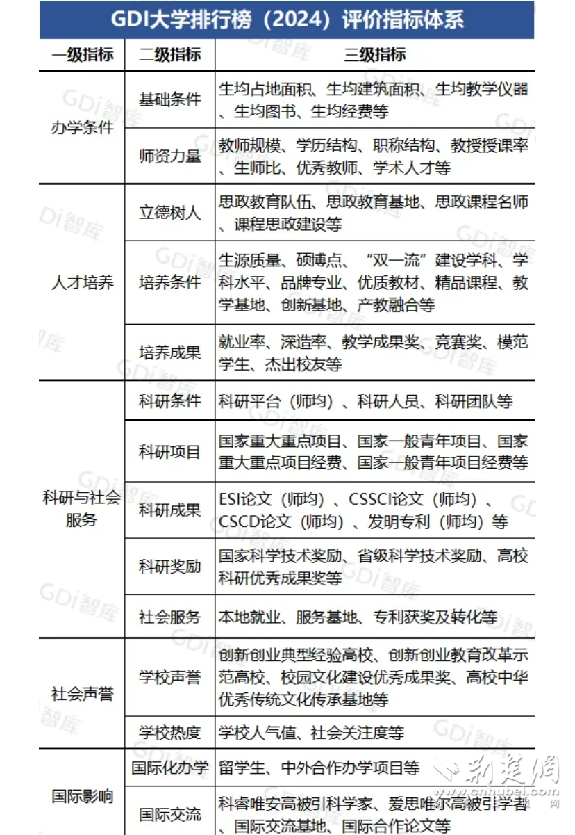 GDI大学排行榜(2024)创新数据运用方法,力求评价更趋精准。该排行榜设办学条件、人才培养、科研与社会服务、社会声誉和国际影响等5个一级指标,下设师资力量、培养条件、培养成果、科研项目、社会服务和学校声誉等14个二级指标以及150多项细分指标,在综合评价中突出人才培养的核心地位,以求更加全面、客观、科学地评价大学的发展现状。
