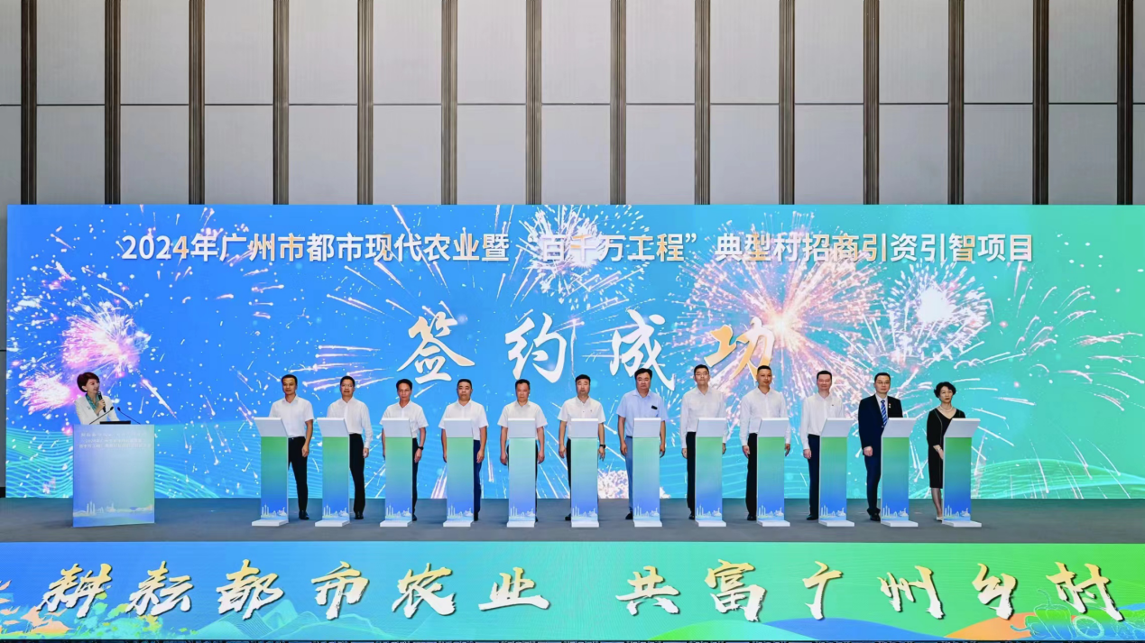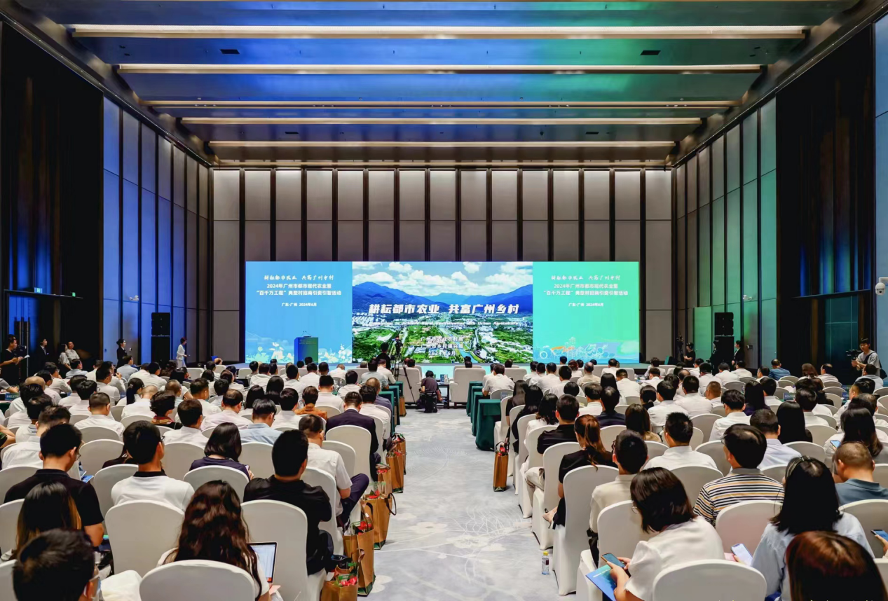 6月19日,“耕耘都市农业,共富广州乡村”2024年广州市都市现代农业暨“百千万工程”典型村招商引资引智活动在广州白云国际会堂举行。活动现场,18个涉农重点项目进行了签约,一批新认定的国家级、省级农业龙头企业代表获颁授牌匾,广州各区农业农村招商小分队获颁授锦旗。