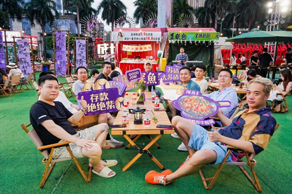 活动当天,探鱼与广佛当地媒体、广佛本地知名行业领袖们沉浸在露营中国风的体验场景中,一起回顾探鱼品牌的发展历程与成就,共同品鉴新品绝绝紫苏牛蛙烤鱼及广佛深35款全新专属新品。