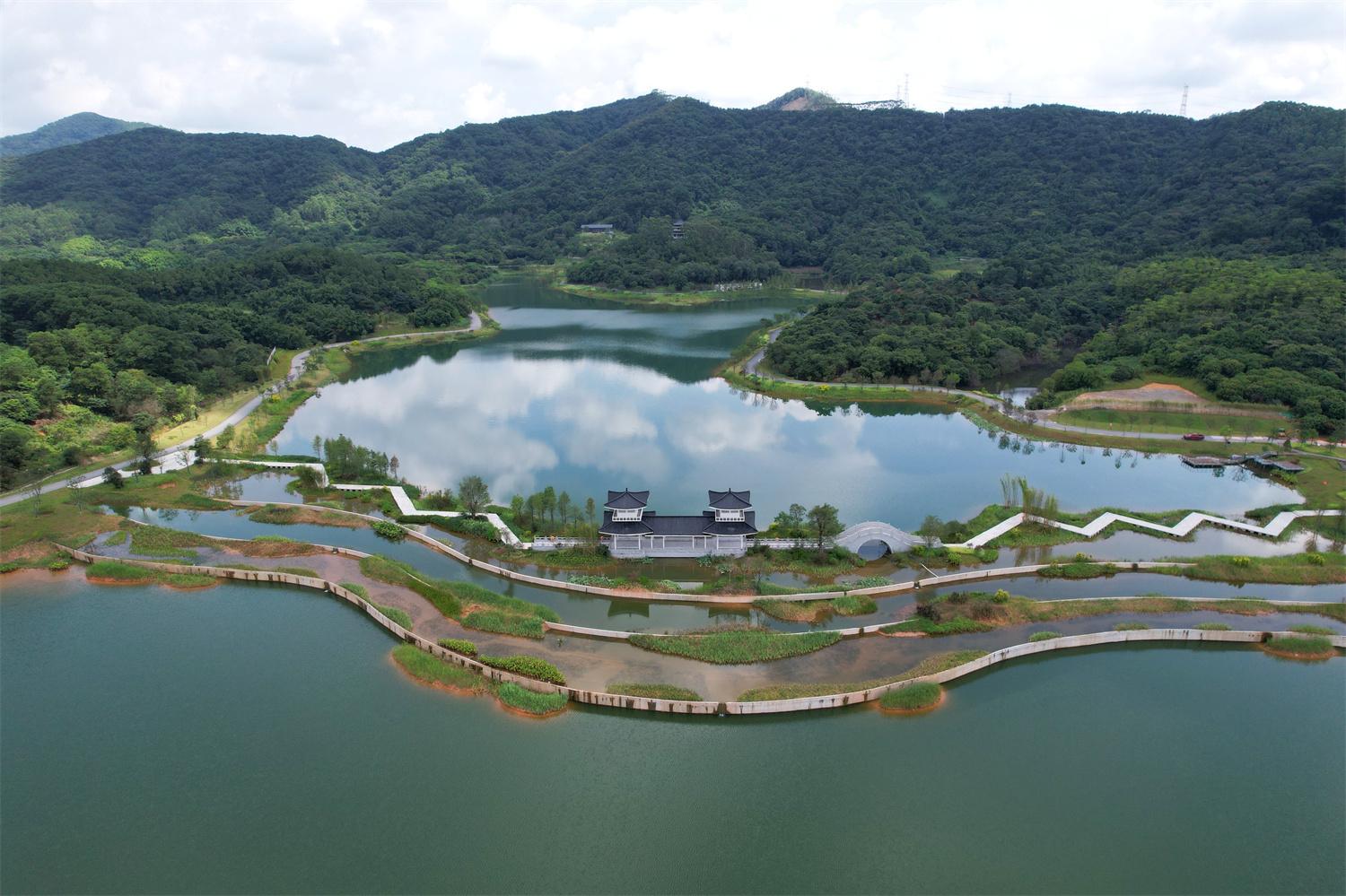 据张冰洁介绍,示范点已融合山水空间、产业空间、人文景观等,形成以迳下东湖为核心,山环水抱、蓝绿交融的格局。