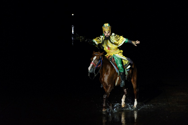 水上烽烟惊乍,再现关公叱咤。刀身在灯光的照耀下闪烁着寒光,这位魁梧的男子单手挥舞长刀,俨然武圣模样,彷佛真正的关羽穿越千年时光,站在观众的眼前。