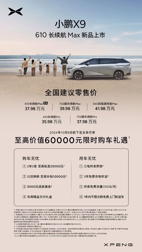 9月25日,小鹏汽车在广州长隆举办小鹏X9新品发布会暨《爸爸再出发》首映礼。小鹏旗下纯电大七座MPV——小鹏X9正式发布全新610 长续航Max版本,官方售价为37.98万元。用户可通过小鹏汽车官方APP、官网、微信小程序以及全国销售网点进行预订,10月8日前下定用户即可享至高价值6万元的购车礼遇。