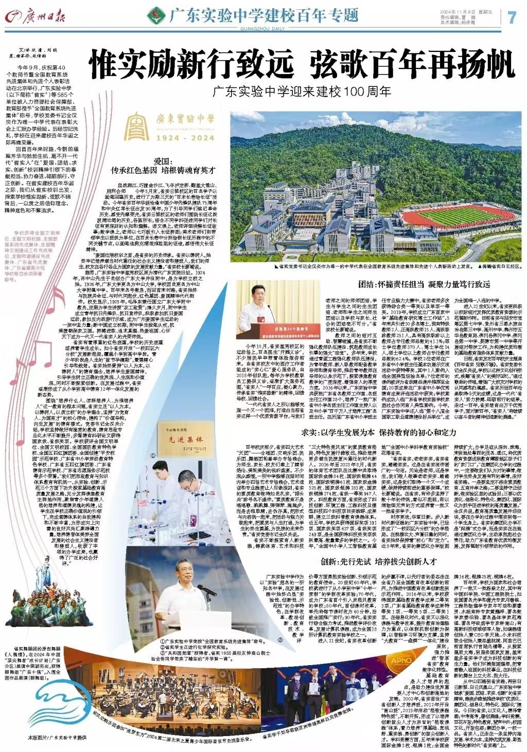 据悉,广东实验中学越秀校区原为清代广东贡院旧址。1924年,孙中山先生于此创办广东大学并设附中,是为学校立校之始。1926年,广东大学更名为中山大学,学校因此更名为中山大学附属中学。百年来名号数易,而回首来时路,省实始终与民族共命运、与时代同起伏,红色基因、爱国精神代代相传。校史显示,1925年,毛泽东兼任国立广东大学附中教员,定期为学生讲授“农工政策”;烽火岁月,附中学生成立青年抗日先锋队、抗日宣传队,积极参加抗日爱国运动,参加反内战游行示威,成为广州爱国学生运动的一股中坚力量;新中国成立初期,附中学生投笔从戎,抗美援朝保家卫国。拼搏进取、追求真理、热爱祖国、心怀天下成为一代又一代省实人的光荣传统。
