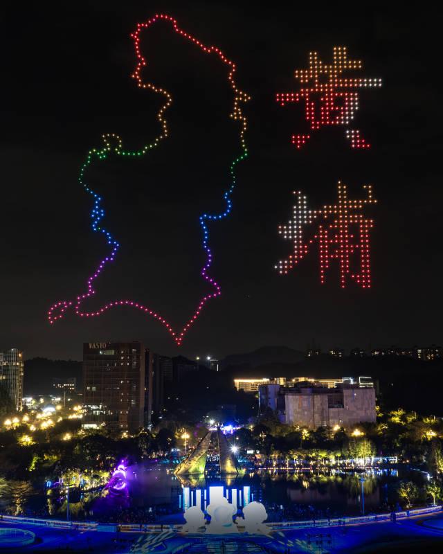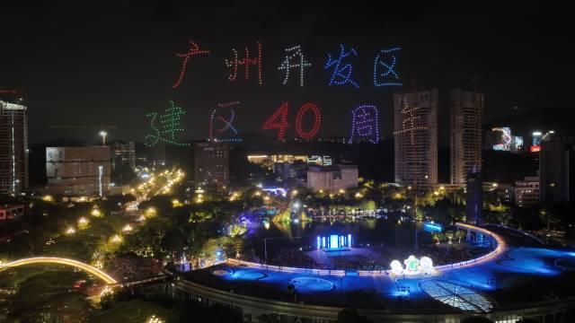 当晚还上演了本次灯光节期间唯一一场无人机表演。伴随着动感的音乐节奏,500架无人机缓缓升空,通过灯光的变化精确地变换着队形,编排出一个时代的时钟,时针从1984年缓缓指向2024年,展现广州开发区的历史变迁。随后,又在夜空中勾勒出“广州开发区建区40周年”“科创黄埔 光绘未来”“三城一岛”“西区开拓者”等造型和图案,呈现出广州开发区、黄埔区现代科技和城市人文交互交融的震撼效果。