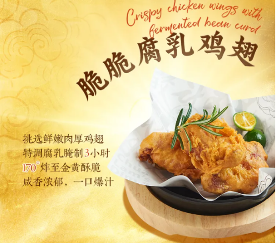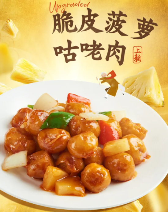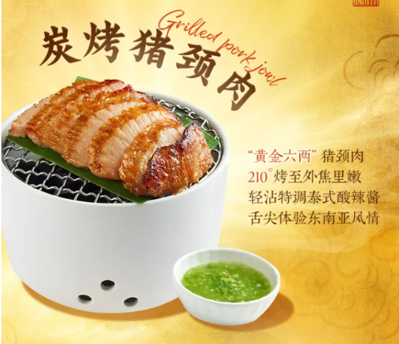 其中,脆皮菠萝咕咾肉以外酥里嫩的口感重塑传统经典;炭烤猪颈肉选用“黄金六两”部位的肉质,搭配泰式酸辣酱,带来异域风情;脆脆腐乳鸡翅则将腐乳的独特风味与鸡肉的鲜嫩多汁完美结合。