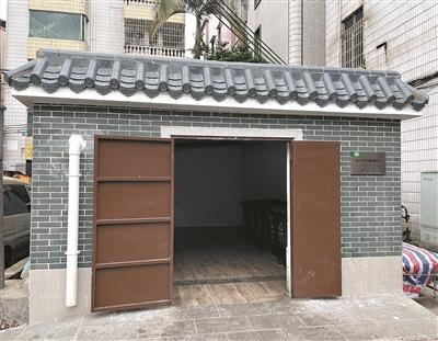 在荔湾区海龙街道海北市场旁边,一座崭新的青砖小屋显得格外别致,走近一看才发现原来这是一处垃圾收运中转站。而在此前,这里只是一处简陋的铁棚架,只做了简单的遮蔽。