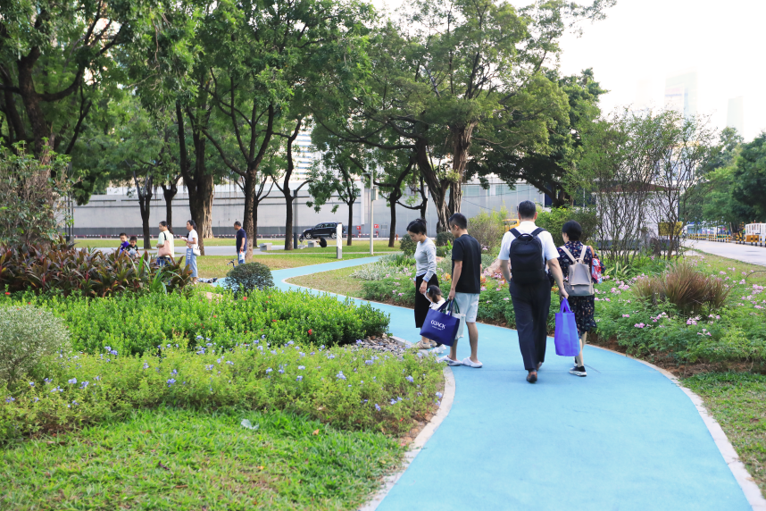 广东省奥林匹克体育中心及周边街区,通过优化街道慢行环境,带动街区环境的整体提升,拓宽奥体南路人行道,将奥体路街角空间改造为全宽式放坡,营造舒适安全的慢行体验。