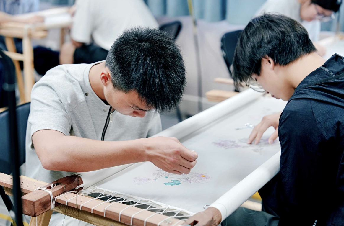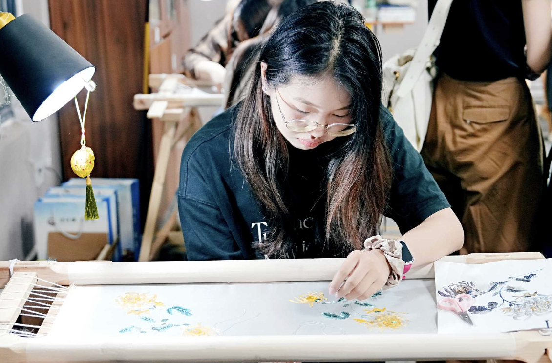 把“大师工作室”搬进校园,开封职业学院将汴绣传承提升至现代职业教育体系高度,创建全国首个系统化培养刺绣非遗人才的专业。课程设计融合汴绣历史、传统针法精髓与当代设计理念,构建“汴绣技法实训—文创产品设计—智能生产管理”三位一体课程体系,培养既精于针法又掌握数字化设计的复合型人才。联合汴绣非遗传承人苗炜教授设立“苗炜大师工作室”,由非遗大师领衔“活态”教学。引入《营造法式》宋代刺绣纹样数据库,开发AR汴绣教学系统,实现非遗技艺的可视化传承。