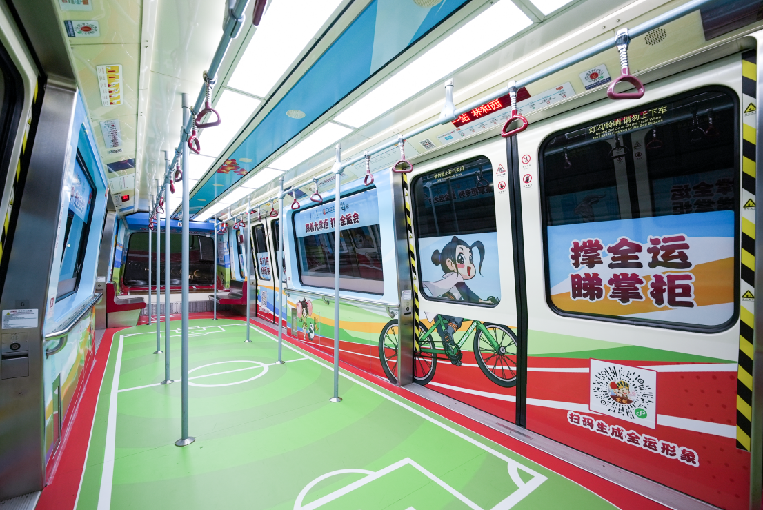 如果说古风车厢是“穿越之旅”,那现代全运风格车厢便是“沉浸式赛场”。车厢内部地面铺着模拟田径跑道的塑胶纹理,红色的“跑道线”沿着车厢走向延伸,搭配绿色“草坪”图案,瞬间营造出置身运动场的热血氛围。车厢门则成为展现广府特色的窗口,靠背印着五羊雕塑、广州塔等标志性建筑,《叫我大掌柜》中的经典人物纷纷化身全运健儿奔驰在赛场上,与全运元素巧妙融合,既凸显了举办地的地域文化,又传递出“全运与城市共生”的理念。