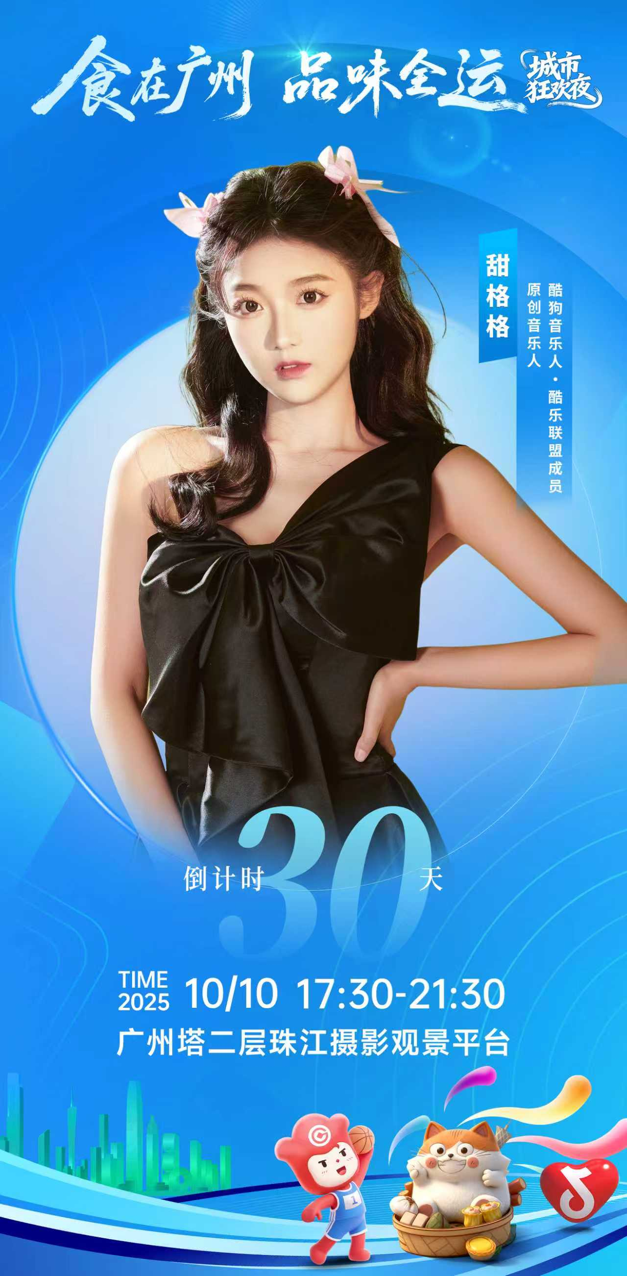 第十五届全国运动会倒计时30天主题活动,酷狗音乐人酷乐联盟成员甜格格受邀登上广州塔二层观景平台,参与十五运会倒计时30天活动之“食在广州 品味全运”城市狂欢夜活动演出,唱响《我在广州好运里》。