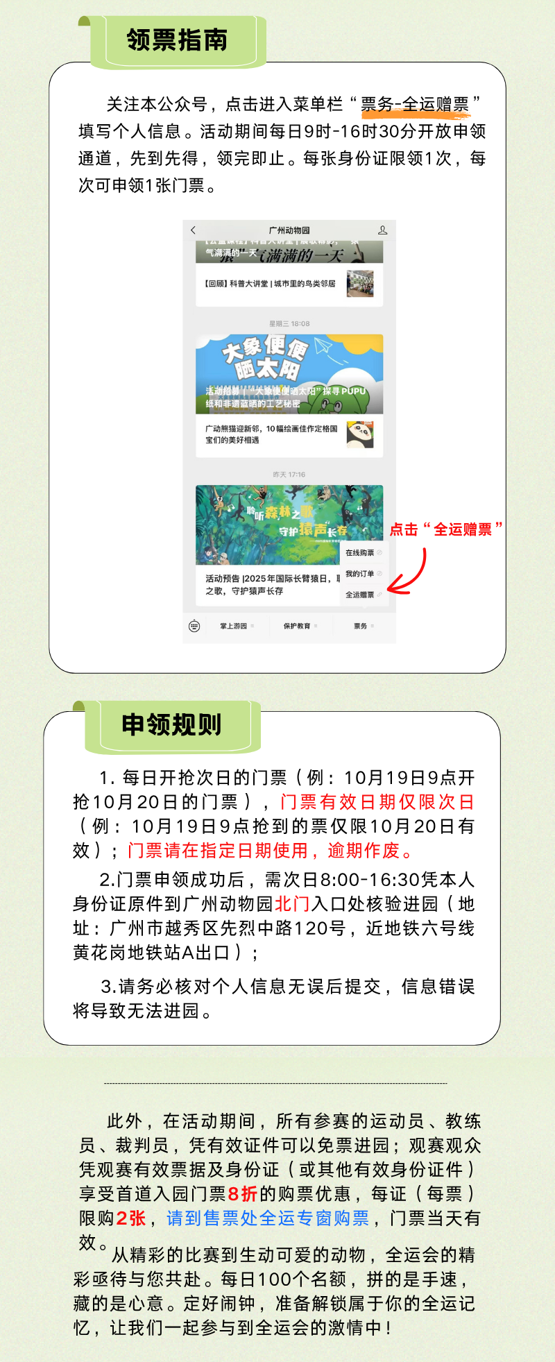 1、关注“广州石门国家森林公园”微信公众号,点击进入菜单栏“预约购票”,点击“全运有礼免费”,填写相关信息即可领票。