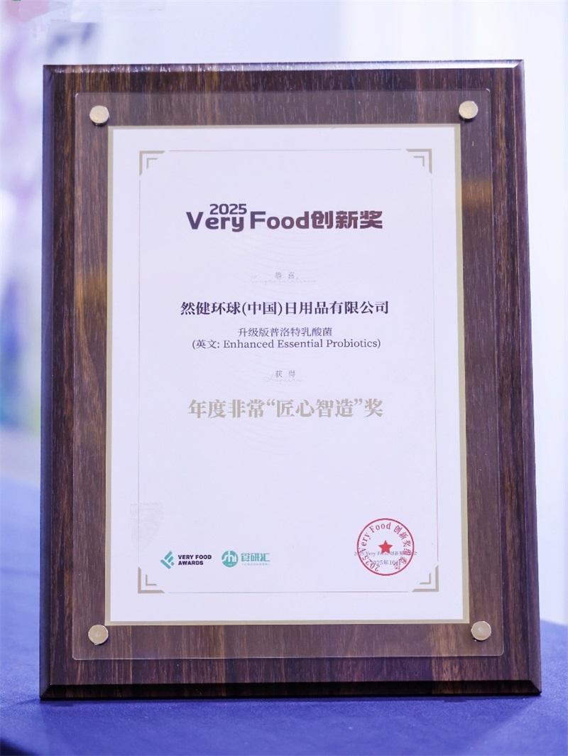 2025年 11月 11日晚,由食研汇 FTA主办的 2025 Very Food创新奖颁奖典礼在杭州国际会议中心举行,本届大赛旨在对食品行业中做出重大贡献、取得巨大成就的上游原料、终端产品和科研创新成果等进行表彰。经过激烈角逐和专家评审,然健环球(中国)日用品有限公司旗下明星产品升级版普洛特乳酸菌获得2025年度非常“匠心智造”奖。