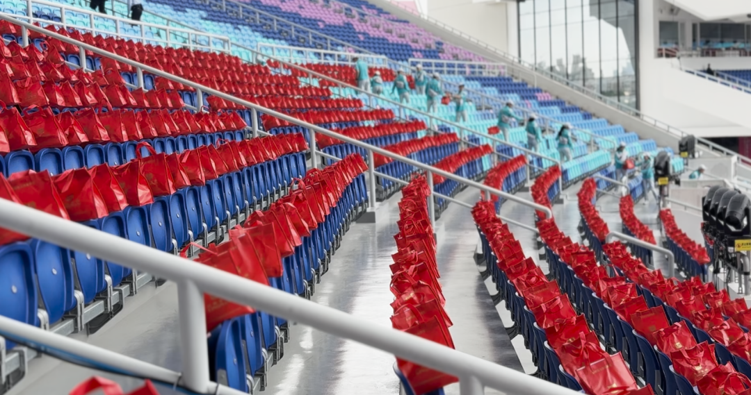 “红色餐包有一两斤重,每次摆放餐包要花两三个小时,我负责的区域是在三层顶楼,离‘猫洞’(每一个区域进入到场馆内的通道)非常远,我们都是靠人链的方式传上去。”身穿青绿色服装的志愿者排成一排,相互传递红色餐包,将其放置在座位上。王子玟说,餐包的摆放也有讲究,不下雨的时候要正着放,下雨时要整齐地把每一个开口部分卷进去,避免它被淋湿。