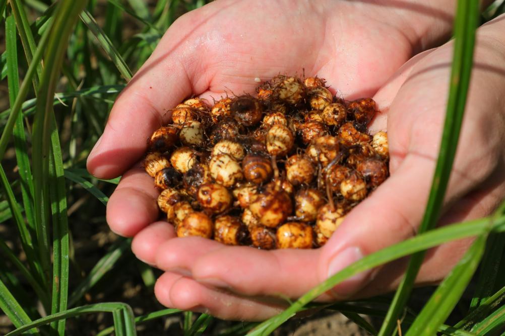 自2019年起,五十四团开始大规模推广油莎豆种植,并在反复试验和探索中形成了“油莎豆+冬小麦”轮作模式。如今五十四团油莎豆种植面积从2万亩扩大到5万亩,亩均产量由试种时的200公斤提高至530公斤(最高850公斤),成为全国单体种植面积最大的油莎豆种植基地。
