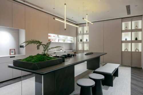 在鸿蒙智家“智慧生活体验区”,玛格家居的餐厅采用隐藏式移门设计,让电视完全融入家居环境,不占用多余的空间,又能随需显现。茶室采用智能茶台,实现隔空传茶,这种“黑科技”将传统茶文化与现代科技创新融合,不仅保证了传茶的效率和稳定性,更给家居生活带来更多便捷和舒适的体验。