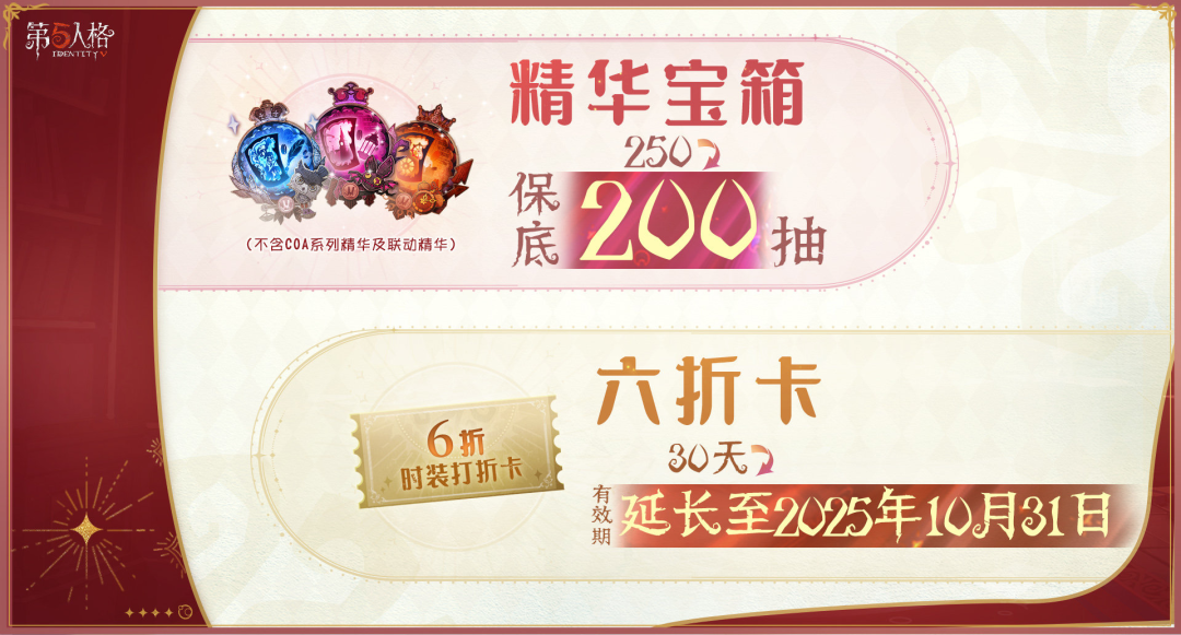 在后续的周年庆版本中,《第五人格》则把重点放在了玩家体验优化上:精华保底从250抽下调至200抽、延长六折时装卡有效期、赠送折扣券等,显示出对玩家反馈的积极响应。
