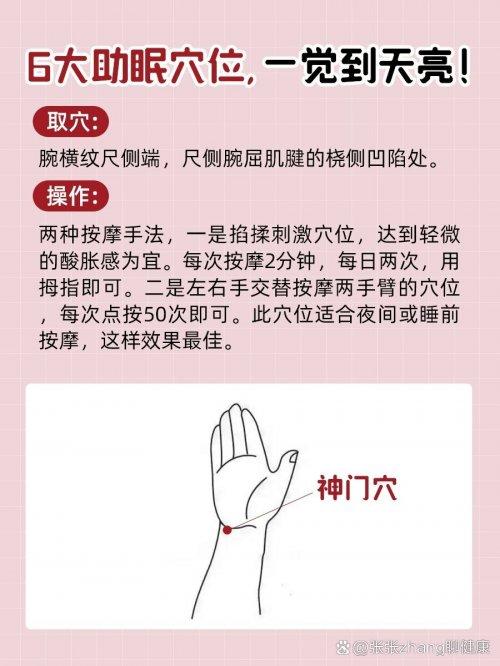 神门穴:是心经原穴,在腕横纹尺侧端。睡前用拇指按揉神门穴 3 分钟左右,酸胀感直达心包,可抑制交感神经兴奋性,减少多梦易醒的情况。