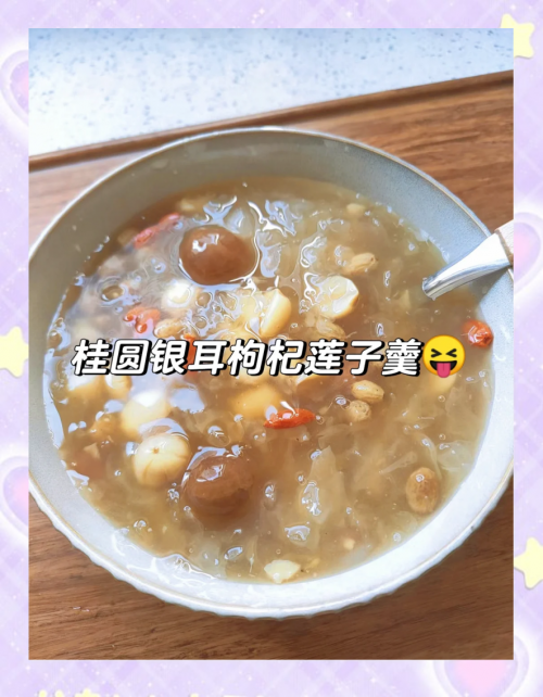 桂圆莲子羹(心肾不交):桂圆肉、银耳、莲子、枸杞煮烂,加少量冰糖,可作为饭后甜品饮用。